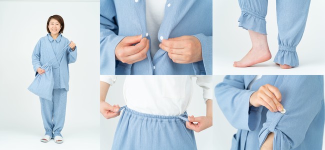 入退院を繰り返す私に寄り添ってくれる、機能的でオシャレなこだわりパジャマ。点滴や注射時に便利な袖口ロールアップや、パンツの着脱時に役立つループなどを採用しました。