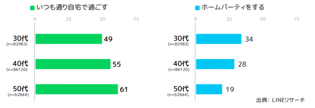年代別で見ると、「いつも通り自宅で過ごす」は50代は30代に比べて+12pt高く、「ホームパーティをする」は逆に50代は30代に比べて-14pt下がる結果に。ライフステージが上がるにつれ、クリスマスの過ごし方にも変化がみられました。