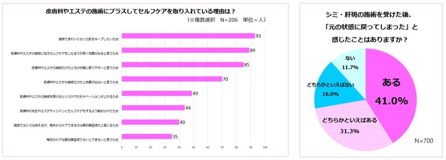 皮膚科やエステの施術にプラスしてセルフケアを取り入れている理由としては、「施術できれいになった肌をキープしたい」(206人中93人)、「早く効果が出ると思うため」(89人)、「皮膚科やエステの施術だけだと元の状態に戻りやすいと思うため」(85人)がトップ3でした。