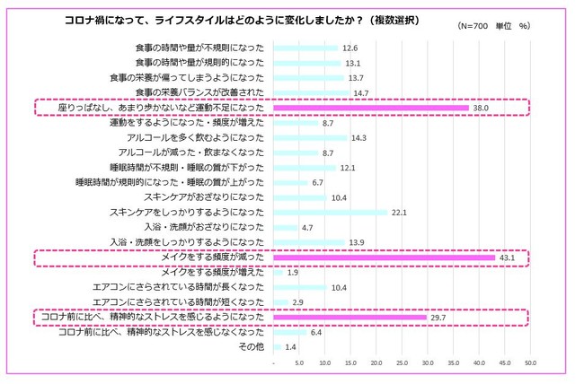 コロナ禍でライフスタイルが変化したかを聞いたところ、「メイクをする頻度が減った」(43.1%)、「座りっぱなし、あまり歩かないなど運動不足になった」(38.0%)、「コロナ前に比べ、精神的なストレスを感じるようになった」(29.7%)が上位に。