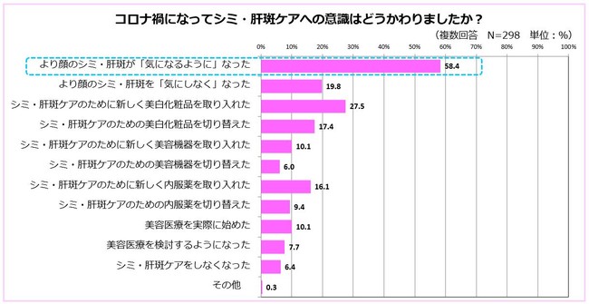コロナ禍以降、シミや肝斑に対する意識が変わったと感じている人42.6%と全体の半数弱を占めました。具体的な意識の変化としては「より顔のシミ・肝斑が『気になるように』なった」(58.4%)という人が多く、「シミ・肝斑ケアのために新しく美白化粧品を取り入れた」という人も27.5%を占めています。