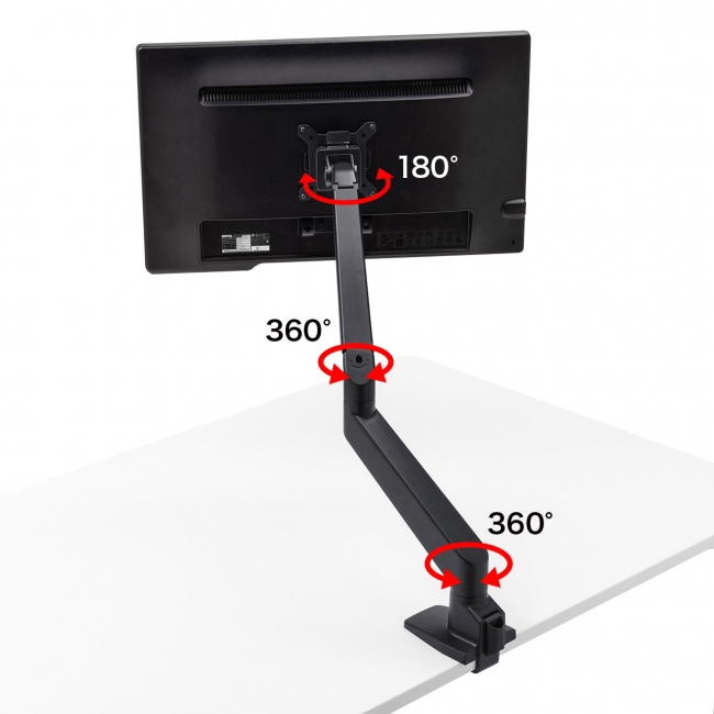 水平アームとガスシリンダーを内蔵した垂直アームを組み合わせているので、少ない力でディスプレイの位置調整を行えます。各アームには2~10kgまでのディスプレイが搭載可能で、VESA規格の取り付けに対応しています。