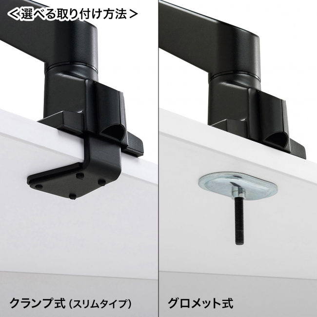 設置方法はクランプ式(板厚10mm~50mmに対応)とグロメット式(板厚60mmまで)が選べます。クランプはスリムタイプを採用しているので、デスクのフレームやバックパネルに干渉しづらくなっています。 ディスプレイからのケーブルは、アーム下面のケーブルホルダーへ通すことができるので、配線をスッキリさせることができます。