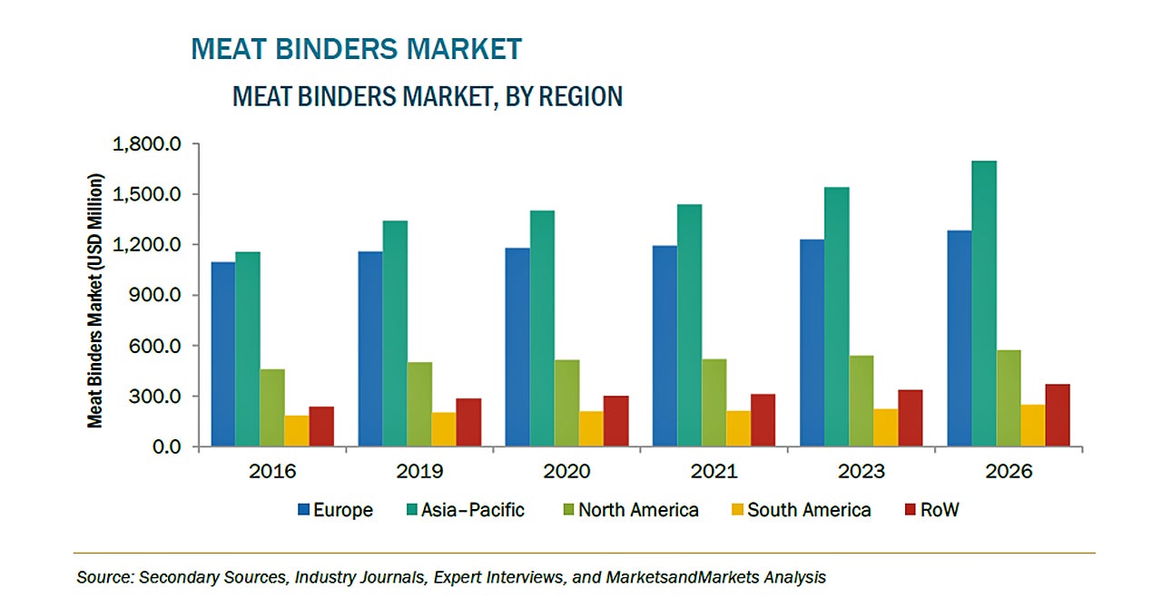 食肉用結着剤(ミートバインダー)の市場規模は、2021年の37億米ドルからCAGR2.6%で成長し、2026年には42億米ドルに達すると予測されています。牛肉、豚肉、鶏肉などの食肉製品の需要が増加していることが、食肉用結着剤市場の主要な牽引要因となっています。